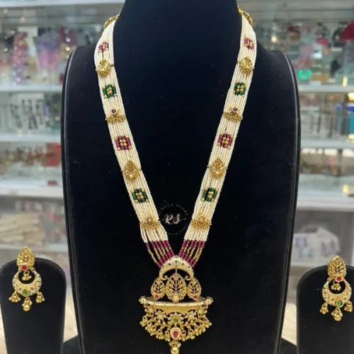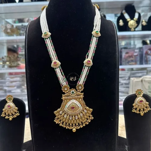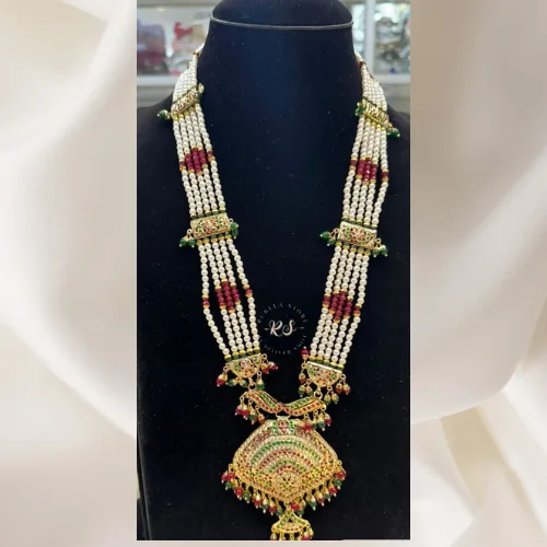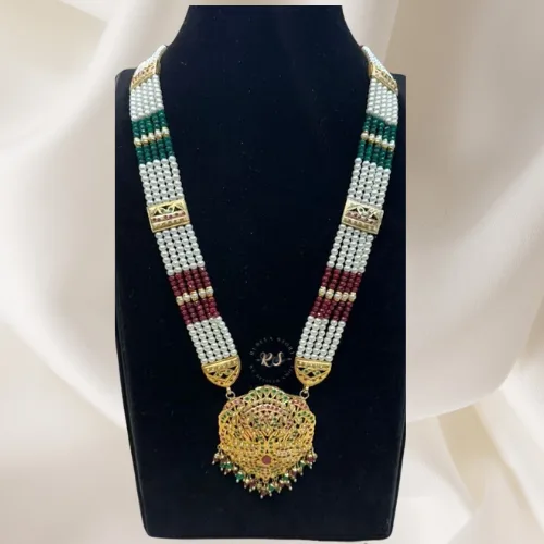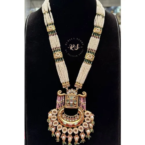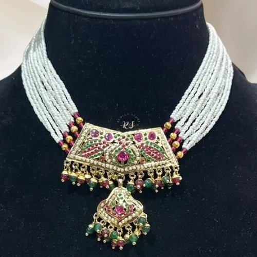 Elevate your look with Rubela Store’s Charming White Pearl Work Jadau Necklace, handcrafted with delicate pearl strands and intricate jadau detailing. Made lovingly by skilled artisans using traditional techniques, this necklace blends soft elegance with timeless heritage. Perfect for weddings, engagements, festive celebrations, or quiet, intimate moments where you want to feel effortlessly graceful. An exquisite piece designed to be cherished, remembered, and passed down as an heirloom.