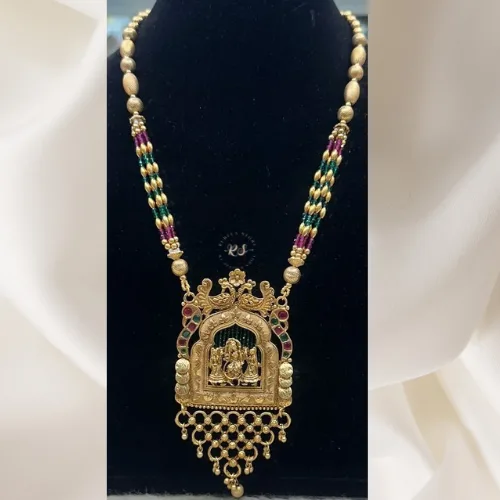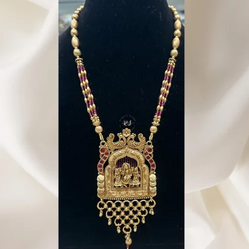 Experience royal elegance with the Rubela Real Look Antique Tarnish Temple Green Mala Set, featuring intricate temple motifs and sparkling green stones. Perfect for wedding functions and festive occasions, this beautifully handcrafted set offers a divine antique finish and a luxurious heritage look.