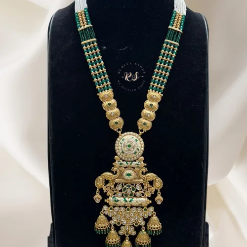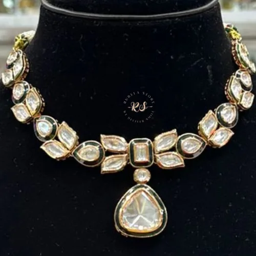 The Royal Heritage Jadau Necklace by Rubela Store is a handcrafted masterpiece born from centuries-old Mughal and Rajasthani artistry. Made with uncut diamonds, rubies, emeralds, and pearls, each necklace is created slowly, lovingly, and entirely by hand—making every piece one-of-a-kind. Lightweight, regal, and deeply personal, this jadau necklace is more than jewellery; it’s a royal story you wear close to your heart.