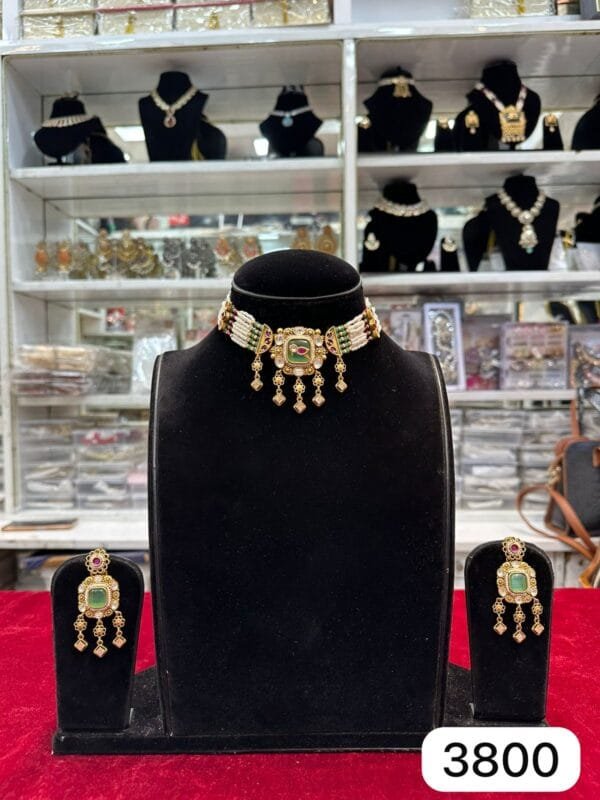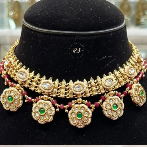 Real Look Jadau Choker Set with Ruby Green Moti Glow