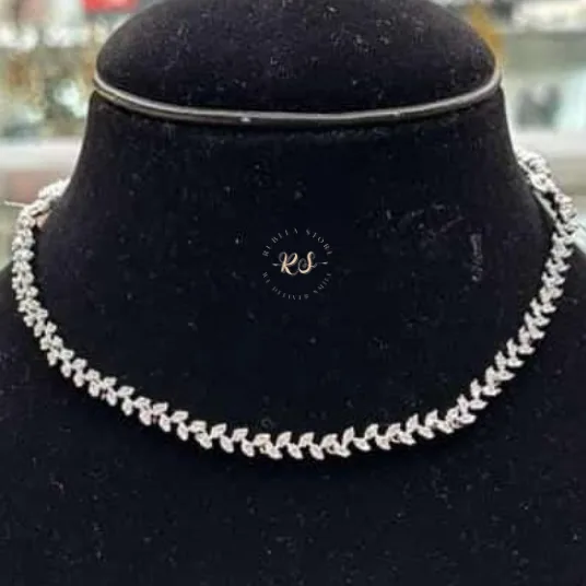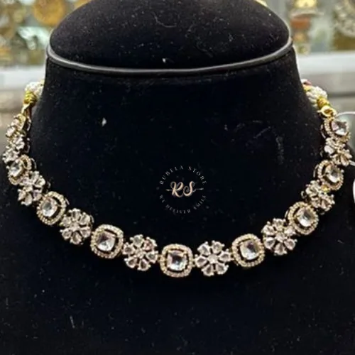 Step into effortless grace with this stunning red mosonite choker set from Rubela Store. Handcrafted with precision, this lightweight set features sparkling diamond-like mosonite stones set in soft antique gold for a regal finish. The choker sits beautifully on the neckline while the matching earrings add just the right touch of elegance. Perfect for weddings, festive nights, parties, and gifting, this versatile jewellery set elevates every outfit—from silk sarees to glamorous gowns.
