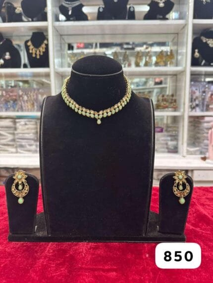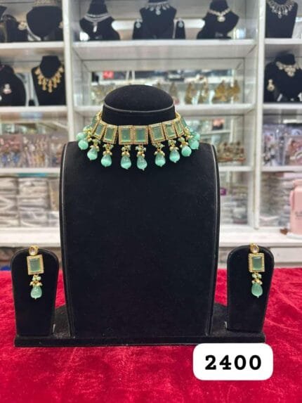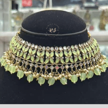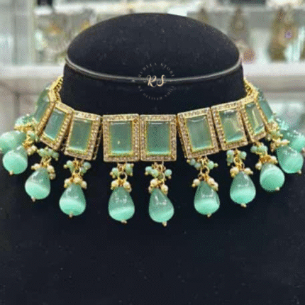 The Golden Kundan Monalisa Mint Set from Rubela Store is made to add elegance and shine to your style. With golden sparkle and mint color stones, this jewelry brings royal beauty to your look. Perfect for weddings and festive events. Visit Rubela Store and follow us on Instagram for more collections.