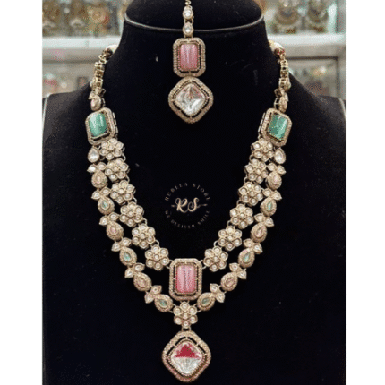 Experience timeless radiance with the Winsome Kundan Mosonite Set by Rubela Store. This handcrafted masterpiece blends classic Kundan artistry with the modern brilliance of moissanite stones. Lightweight, elegant, and perfect for weddings, festive events, and gifting, the set includes a graceful necklace, matching earrings, and an optional maang tikka. A royal glow for every moment.