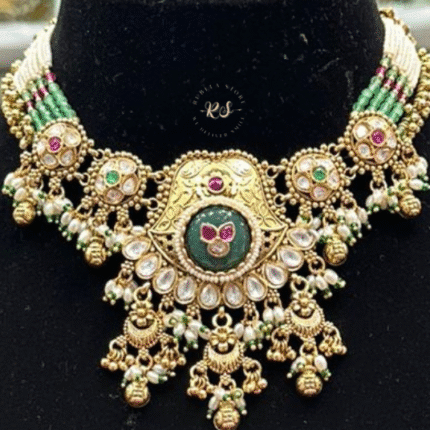 The Real Look Golden Green Heritage Set from Rubela Store is a beautiful blend of tradition and elegance. With its rich golden polish and green stone detailing, this handcrafted jewelry adds royal beauty to any outfit. Perfect for festive wear and weddings. Follow @rubelastore on Instagram for more.
