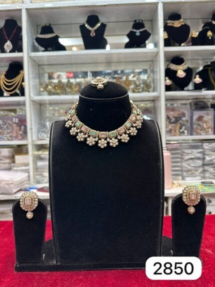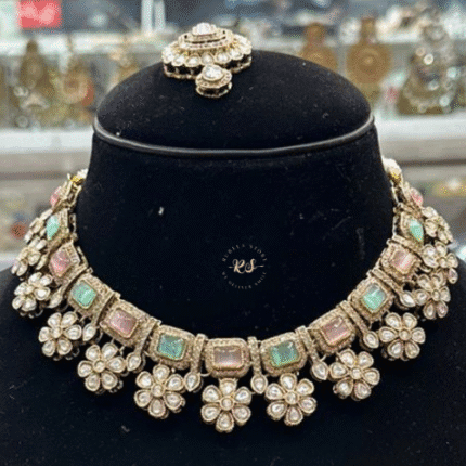 Add soft royal charm to your style with this real look mozonite set with mint pink colour from Rubela Store Designed with premium shine and elegant finish this set is perfect for weddings festive functions and special occasions