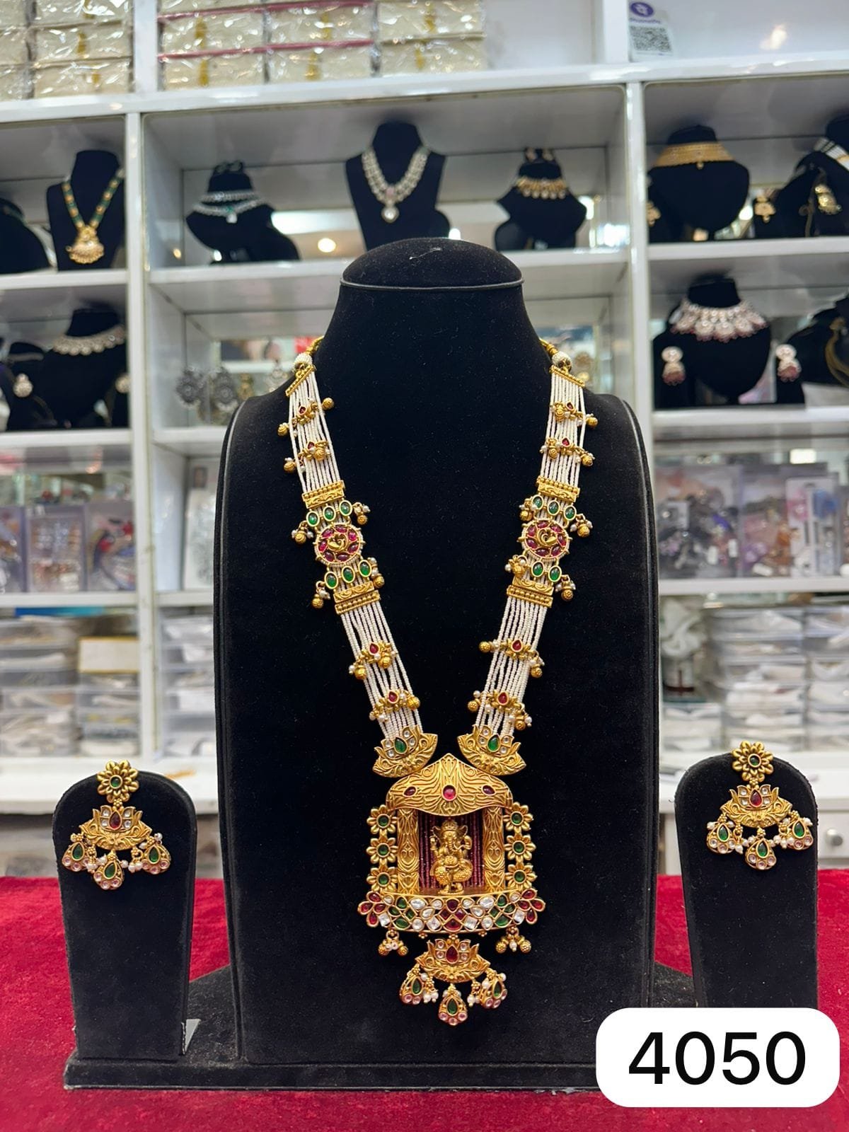This long set is made with strong metal and premium quality polish with ruby and green moti stones