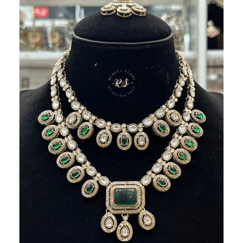 Upgrade your ethnic style with this real look mozonite set with green colour from Rubela Store Designed with premium finish this set is perfect for weddings festive events and special occasions It gives a rich elegant and graceful look