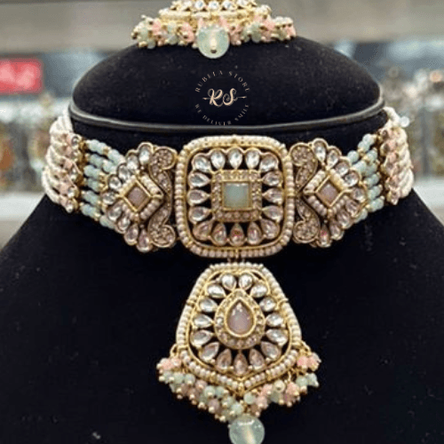 Enhance your traditional look with this real look kundan choker set with pink mint stones from Rubela Store Designed with premium finish this set is perfect for weddings festive events and special occasions It gives a fresh elegant and royal look