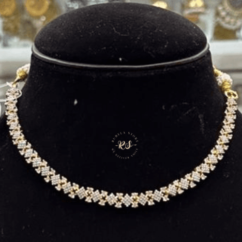 The Real Look Golden AD Set from Rubela Store brings classic beauty to your look. Made with premium AD stones and smooth golden polish it gives a real jewellery shine. Perfect for weddings parties and festive wear. Light weight elegant and easy to wear.