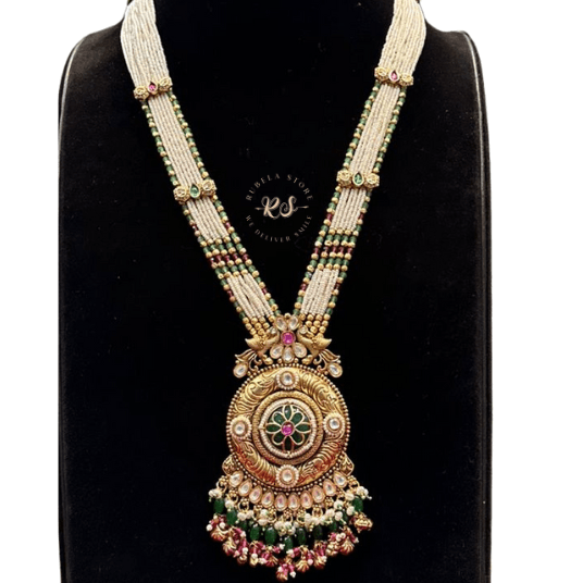 The real look green moti long set is a beautiful jewellery piece made for women who love classic beauty and simple style This long set gives a rich and royal look that makes your outfit look more graceful It is perfect for weddings festivals family functions and special events