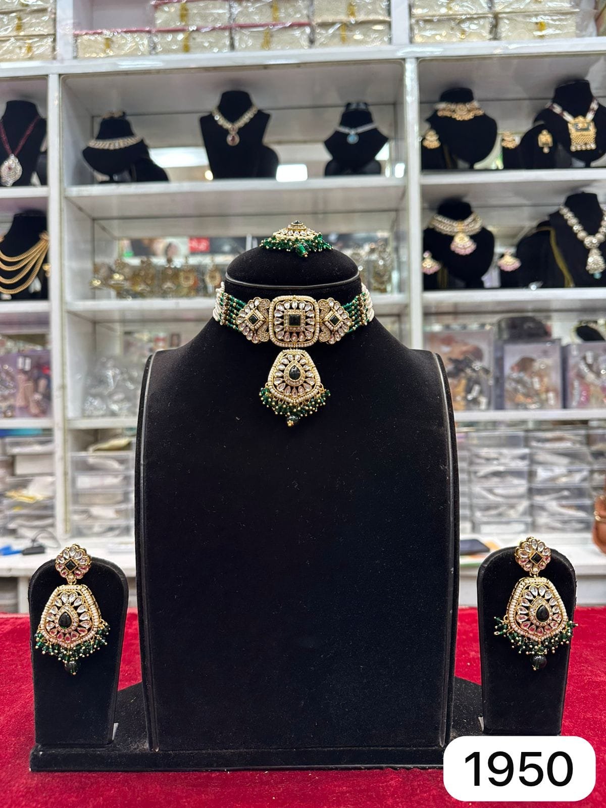 This set looks beautiful with saree lehenga anarkali and ethnic suits Green stones match well with red gold cream and pastel shades