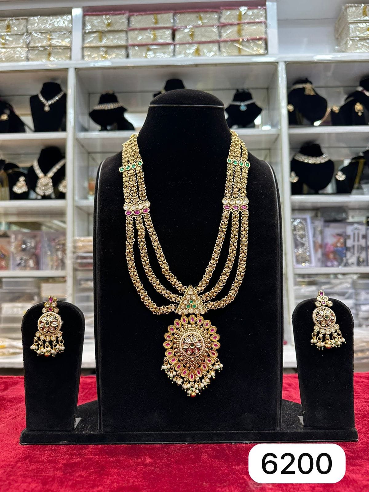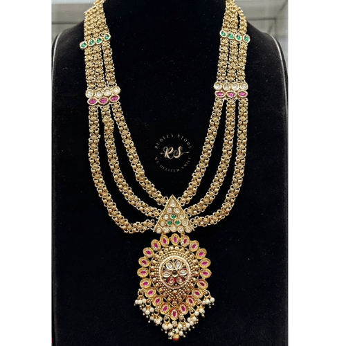 The Real Look Long Toda Set is made with high grade alloy metal and fine stones. The polish gives a real look shine and keeps the jewelry bright for a long time. The metal is smooth on the skin and does not feel harsh. The stones are fixed strongly so they do not fall off easily.