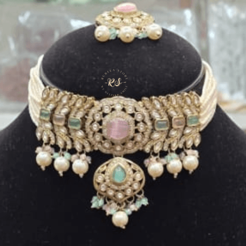 The soft pink and mint shades give this choker set a calm and royal feel These colors look beautiful on all skin tones and are easy to match with many outfits You can wear this set with sarees lehengas suits and gowns