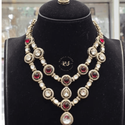 The rubi color gives this jewellery set a bold and elegant feel It pairs beautifully with sarees lehengas suits and gowns The real look finish makes the jewellery appear rich and luxurious like fine jewellery