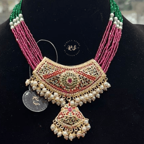 This real look jadau short set with hydrow rubi green moti is a beautiful piece that adds charm to every special day. It gives a royal and elegant look that makes you feel confident. Rubela Store brings this premium jewellery with love and care so you enjoy the best shine and quality.