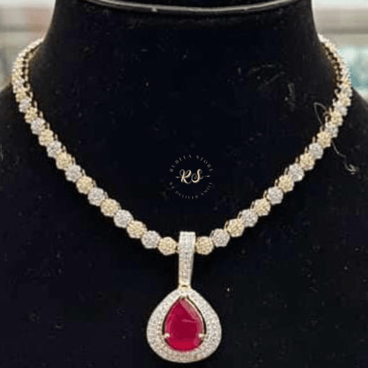 The Real Look Golden Diamond Ruby Set is a fine imitation jewelry piece made to resemble real diamond and ruby jewelry. The golden finish adds richness, while the ruby stones bring a hint of warmth and tradition.