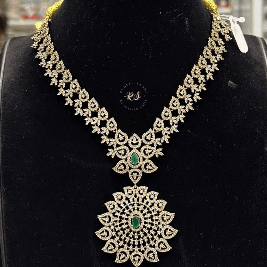 This set includes a detailed necklace with matching earrings. The combination of green and white stones makes it suitable for bridal functions, festive events, and parties. Whether it’s your wedding or a special day, this set will make you stand out.