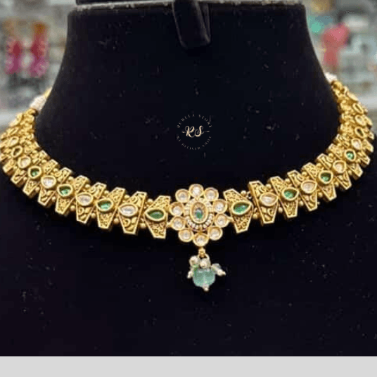 The Real Look Golden Ruby Green Set is designed to offer the perfect mix of traditional charm and modern elegance. It includes a necklace and matching earrings featuring ruby red and emerald-like green stones in a golden finish.