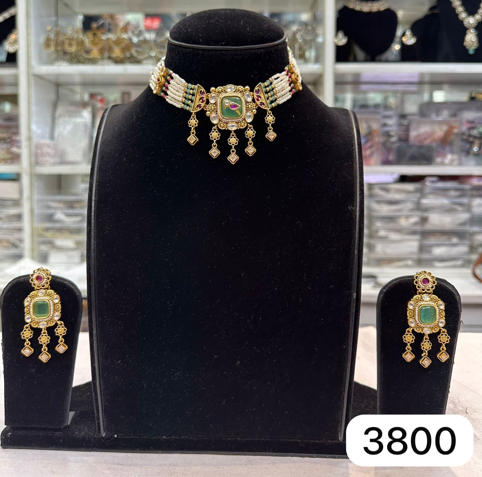 The set includes a beautifully designed choker necklace along with matching earrings. The design highlights classic motifs and intricate patterns inspired by royal Indian jewelry. This makes it a perfect statement piece for brides, bridesmaids, or anyone looking to add elegance to their outfit.