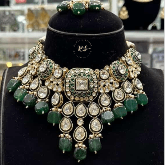 Add charm with the Real Look Mina Kari Green Set from Rubela Store. This handcrafted jewelry has bright green Mina Kari work and sparkling stones. Perfect for weddings and festive occasions. Visit @rubelastore on Instagram for more beautiful designs.