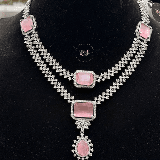 The design of this Real Look Diamond Set focuses on blending simplicity and luxury. The soft pink tone adds a warm and graceful feel, while the sparkling diamond-like stones create a stunning glow. The necklace sits perfectly on your neckline, and the matching earrings complete the look beautifully.