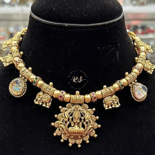 The design of the Real Look Golden Set is inspired by royal Indian traditions. Each piece is made with detailed craftsmanship and high-quality polish that gives a rich golden glow. The necklace sits perfectly around the neck, while the earrings complete the look with elegant balance.