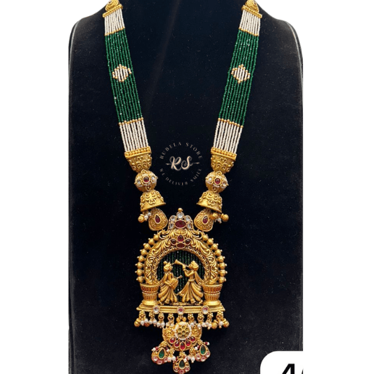 The Real Look Green Moti Long Set from Rubela Store features a beautiful long necklace with rich green moti and matching earrings. It gives a royal traditional look while staying light and comfortable. Perfect for weddings festivals and special events.