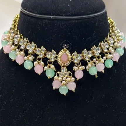 Add a touch of elegance with the Rubela Real Look Pink Moissanite Set, featuring sparkling pink moissanite stones and intricate design work. This stunning set includes matching earrings, perfect for weddings, parties, and festive occasions. Lightweight, skin-friendly, and durable, it brings a royal, sophisticated charm to ethnic wear and bridal ensembles.