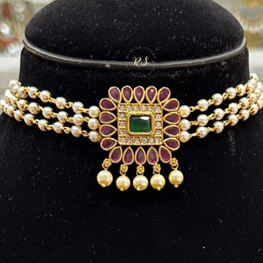 This jewelry set adds an instant glow to your outfit, whether it’s a saree, lehenga, or gown.