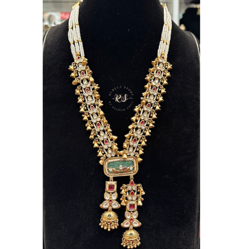 The set usually comes with a necklace and matching earrings. Some designs may include a maang tikka.