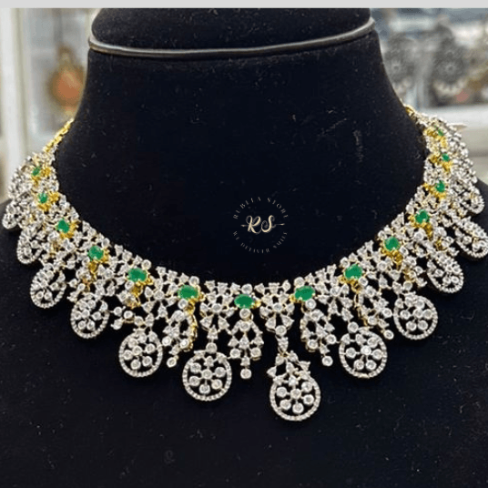 The charm of this set lies in its beautiful combination of white diamond sparkle and elegant green stones. The soft green tone adds a refreshing touch that perfectly balances the shine of the diamonds. It brings out a look that feels modern yet traditional.