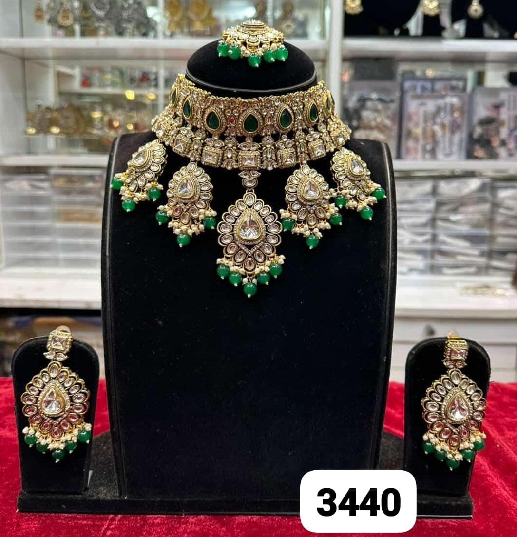 This jewelry set combines the elegance of traditional kundan work with the richness of bright green accents. The necklace features intricate craftsmanship and a heavy yet balanced design that stands out beautifully when worn.