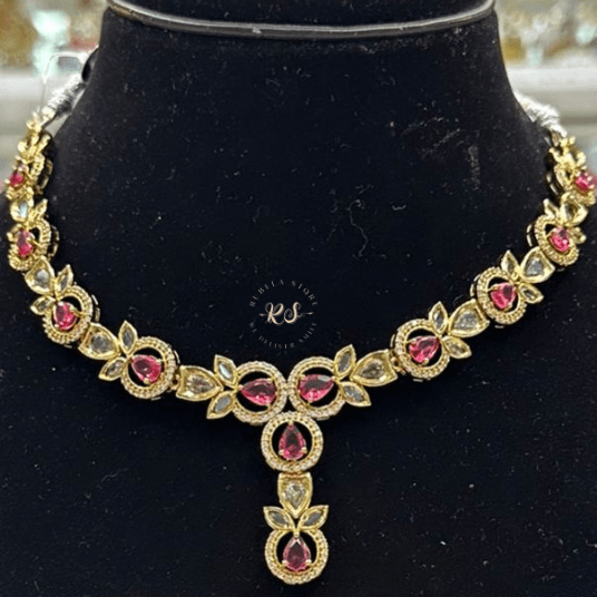 It pairs beautifully with sarees, lehengas, gowns, or fusion outfits. The red Rubi stones combined with Mozonite sparkle match bright and pastel colors alike.