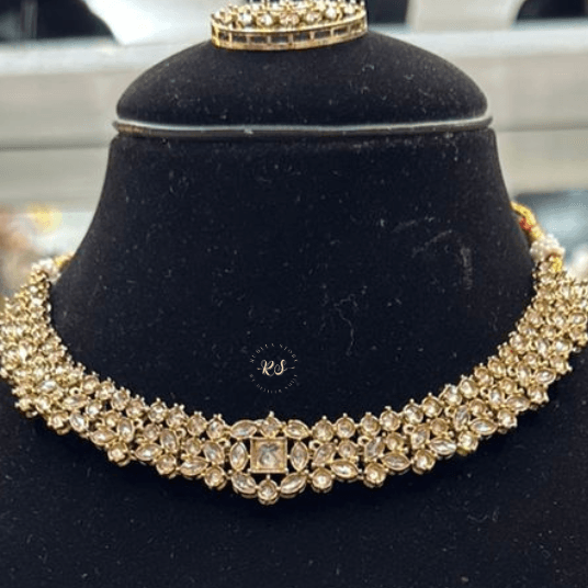 The Real Look Golden Polki Set from Rubela Store is made to bring a royal touch to your look. This jewelry set combines the glow of gold with the rich detailing of Polki stones, creating a style that’s traditional yet elegant.