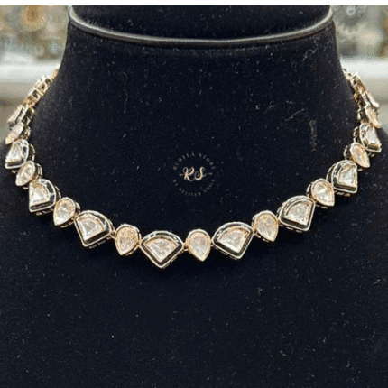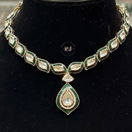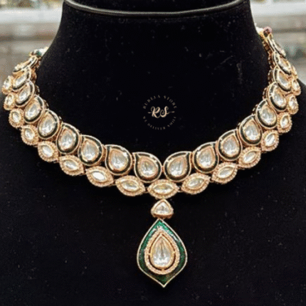 The Real Look Kundan Set from Rubela Store gives a bright and royal shine. It is crafted with care and made to look rich and elegant. Perfect for weddings and festivals this set adds beauty to any outfit. Rubela Store brings you premium quality jewelry that feels light and looks stunning for all special days.