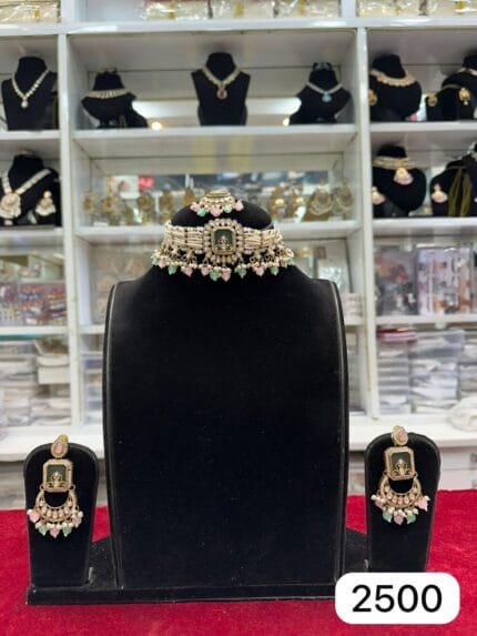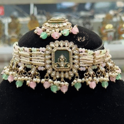 Real Look Heritage Golden Polki Choker Set Pink Mint