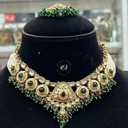 This real look green kundan set from Rubela Store gives a rich royal and beautiful shine The bright green stones match many outfits and add a classy touch The set is light smooth and perfect for weddings parties and festivals Rubela Store brings premium quality jewellery with trusted finishing